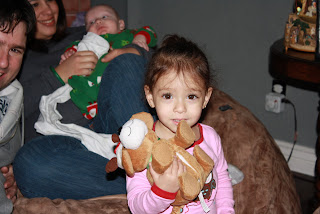 Jenn and Nixon ready to open all of Nixon's gifts. Nixon looks preturbed.:)